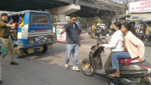 शहर के प्रमुख चौराहों एवं संवेदनशील मार्गों पर सघन चेकिंग कर ट्रिपल राइडिंग, बिना हेलमेट वाहन संचालन तथा यातायात नियमों का उल्लंघन करने वाले चालकों के विरुद्ध कड़ी कार्रवाई की गई।