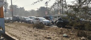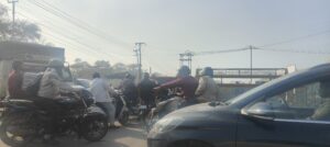 पुलिस बूथ के कुछ ही दूरी पर जाम से बेहाल हुए लोग, रुक-रुक कर चली गाड़िया