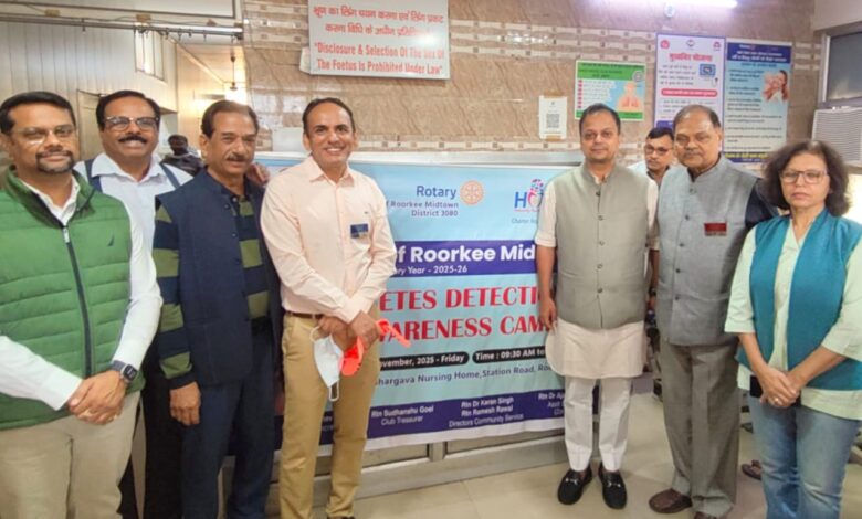 (इमरान देशभक्त) रुड़की। रोटरी क्लब रुड़की मिडटाऊन द्वारा विश्व मधुमेह दिवस पर नि:शुल्क मैडिकल कैम्प का आयोजन भार्गव नर्सिंग होम में किया गया। जिसमें लगभग डेढ़ सौ लोगों की मधुमेह (शूगर) से सम्बन्धित HBA1C,ब्लड शूगर एवं पीएफटी की जाँच की गई। जाँच में पांच लोगों में गम्भीर रोगों के लक्षण पाए गए।सभी रोगियों को डॉ० अजय भार्गव द्वारा नि:शुल्क परामर्श दिया गया।डॉ० भार्गव द्वारा चार रोगियों को निःशुल्क ग्लूको मशीनें भी उपलब्ध कराई गई, ताकि वह घर पर रह कर ही अपनी शूगर की जाँच नियमित रूप से करते रहें। इस अवसर पर रोटरी इंटरनैशनल डिस्ट्रिक्ट के सहायक गवर्नर रोटेरियन डॉ० अजय भार्गव, क्लब अध्यक्ष डॉ० विकास त्यागी, सचिव अनुभव गुप्ता, रमा भार्गव, डॉ० सुधीर चौधरी, डॉ० मधुलिका, अक्षय प्रताप सिंह, हिमांशु सिंह पुंडीर, रमेश रावल, रो०राजीव पृथी, कमल धवन, संजय सिंघल, डॉ० मधुरिमा, गौरव गिरी आदि उपस्थित रहे।