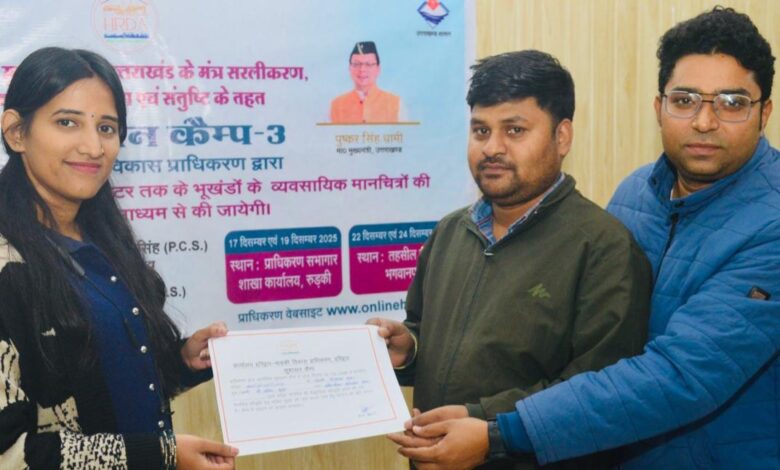 (रजत चौहान) हरिद्वार। मुख्यमंत्री पुष्कर सिंह धामी के सरलीकरण, समाधान, निस्तारण एवं संतुष्टि के मंत्र को आगे बढ़ाते हुए हरिद्वार–रुड़की विकास प्राधिकरण (HRDA) द्वारा आज सुशासन कैंप का सफल आयोजन ब्लॉक सभागार बहादराबाद हरिद्वार में किया गया। इससे पूर्व भी दो सुशासन कैंप आयोजित किए जा चुके हैं।