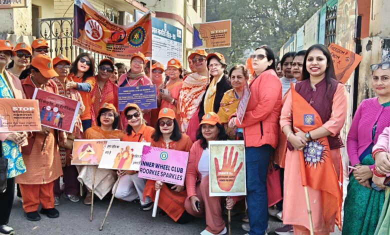 (इमरान देशभक्त) रुड़की। इनरव्हील क्लब 308, जोन-10 द्वारा ऑरेंज कैंपेन के अंतर्गत महिलाओं के विरुद्ध हिंसा के प्रति जागरूकता फैलाने हेतु एक प्रभावशाली रैली का आयोजन किया गया। रैली का शुभारंभ प्रातः नगर निगम रुड़की से हुआ, जिसे मेयर अनीता देवी अग्रवाल ने झंडी दिखाकर रवाना किया। वहीं अनीता देवी अग्रवाल ने क्लब सदस्यों के साथ पूरे सिविल लाइन बाजार में नारों के साथ उत्साहपूर्वक भाग लिया और समाज को यह सशक्त संदेश दिया कि नारी किसी से कम नहीं है और उसके सम्मान में ही समाज का मान है, रैली बोट क्लब तिराहे पर समाप्त हुई। बीच रास्ते में मेथोडिस्ट कॉलेज की छात्राओं ने नुक्कड़ नाटक के माध्यम से महिला सशक्तिकरण और संवैधानिक अधिकारों पर जोरदार प्रस्तुति दी,जिसने उपस्थित नागरिकों को जागरूक किया। रैली के माध्यम से क्लब ने नारी सम्मान, सशक्तिकरणऔर हिंसा के विरुद्ध आवाज को जन-जन तक पहुँचाया गया। इस अवसर पर सुजाता आहूजा, डॉ० रमा भार्गव, शशि कीर व जोन-10 के पांचों क्लब के अध्यक्ष रजनी नागपाल, निशा सुराणा, पूजा लूथरा, ममता सिंह, पूनम परिधा और अन्य सदस्य उपासना मित्तल, नीलम मधोक शूबी, तरणजीत, नेहा गुलाटी, कमलेश सरीन, साक्षी, रीतिका सोनिया, नीलू धवन, सांची सरीन, सरिता अरोड़ा, सरिता पुंडीर, जनक कोहली, दिव्या, महिमा, शिल्पी, मोनिका पाल, सीमा जैन, ऋतु टंडन आदि प्रमुख रूप से मौजूद रहे।
