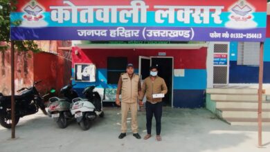 (फिरोज अहमद) लक्सर। खबर हरिद्वार के मंगलौर से है जहां मंगलौर कोतवाली पुलिस ने मुख्यमंत्री के ड्रग्स फ्री देवभूमि मिशन अभियान के तहत एसएसपी के निर्देश पर नशे के खिलाफ बड़ी कार्रवाई की है। मंगलौर पुलिस ने नशे के इंजेक्शनौ की तस्करी करने वाले एक आरोपी को गिरफ्तार किया है जिसके कब्जे से पुलिस ने 16 नशीले इंजेक्शन सहित 19 सीरीन्ज बरामद की आरोपी का पुराना आपराधिक इतिहास भी है। आरोपी तस्कर आमिर मंगलौर के ही मोहल्ला किला का ही निवासी हैं जिसके खिलाफ मंगलौर पुलिस एनडीपीएस एक्ट के तहत मुकदमा दर्ज कर अग्रिम वैधानिक कार्रवाई में जुटी है।