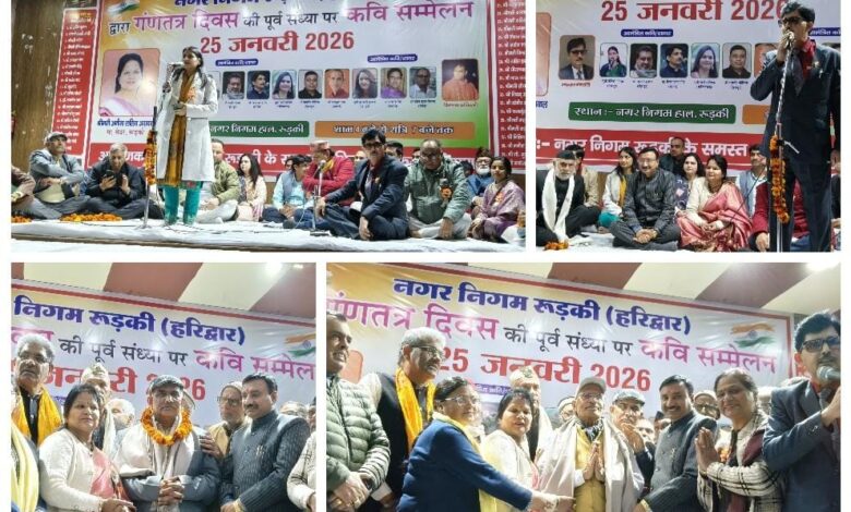 (इमरान देशभक्त) रुड़की। गणतंत्र दिवस की पूर्व संध्या पर नगर निगम की ओर से अखिल भारतीय कवि सम्मेलन का आयोजन किया गया। जिसमें देशभर से आए कवियों ने राष्ट्रप्रेम, देशभक्ति तथा वीरता से पूर्ण कविताएं प्रस्तुत कर श्रोताओं को वाह-वाही करने पर मजबूर कर दिया। कवि सम्मेलन का शुभारंभ मेयर अनीता ललित अग्रवाल, वाणिज्य अधिकारी नगर निगम एसपी गुप्ता, वरिष्ठ पार्षद डॉ० नवनीत शर्मा, जेपी शर्मा, मेयर प्रतिनिधि ललित मोहन अग्रवाल आदि अतिथियों ने सरस्वती वंदना के साथ दीपक प्रज्ज्वलित कर किया। अंतर्राष्ट्रीय शायर अफजल मंगलौरी और कवि किस्लय सैनी के संयोजन में सम्मेलन में देशभर से आए कवियों ने भाग लिया, जिनमें मोनिका अरोड़ा, जसवीर हलधर, विनय प्रताप सिंह, परमवीर कौशिक, गार्गी कौशिक, रामकुमार राम, प्रदीप दीवाना, प्ररेणा कौशिक, बलराज सिंह, गोपाल नारसन, लक्ष्मी आर्या, राजेन्द्र सिंह, उदयवीर सिंह आदि ने देशभक्ति व वीररस की कविताएं सुना कर श्रोताओं को वाह-वाही करने पर मजबूर कर दिया। कार्यक्रम की अध्यक्षता वरिष्ठ समाजसेवी ईश्वर लाल शास्त्री ने की।इस अवसर पर कवियों, शायरों को विशिष्ट अतिथिगण राज्य मंत्री स्तर श्यामवीर सैनी व शोभाराम प्रजापति, सुभाष सरीन, पं० दिनेश कौशिक, सावित्री मंगला, सुशील त्यागी, डॉ०नैयर काजमी, प्रिंसिपल नरेंद्र सिंह, अशोक पाल सिंह शिक्षक द्वारा सम्मानित किया गया। कार्यक्रम का संचालन अफजल मंगलौरी व किस्लय सैनी द्वारा संयुक्त रूप से किया गया। अंत में मेयर अनीता देवी अग्रवाल द्वारा स्वतंत्रता संग्राम उत्तराधिकारियों का भी सम्मान किया गया।