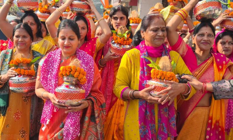शिव मंदिर में विष्णु महायज्ञ और श्री भागवत कथा के शुभारंभ अवसर पर 101 महिलाओं ने नगर में निकाली भव्य शोभायात्रा