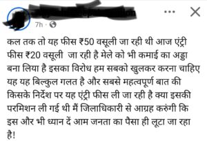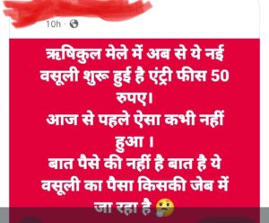 वहीं सोशल मीडिया पर भी कुछ लोगों द्वारा मेले देखने के लिए 50 रुपए प्रवेश एंट्री ओर 20 रुपए पार्किंग को लेकर सोशल मीडिया पर भी जंग छिड़ गई है। जी हां कुछ लोगों द्वारा सोशल मीडिया के माध्यम से ऋषिकुल मैदान में पार्किंग और एंट्री फीस को लेकर जिलाधिकारी से कार्रवाई की मांग की जा रही है। लोगों द्वारा सोशल मीडिया पर एंट्री फीस और पार्किंग को लेकर चर्चाएं तेज हो गई है और एंट्री फीस के साथ ही प्रवेश द्वार की एंट्री को लेकर प्रशासन पर भी सवाल खड़े किए जा रहे हैं।