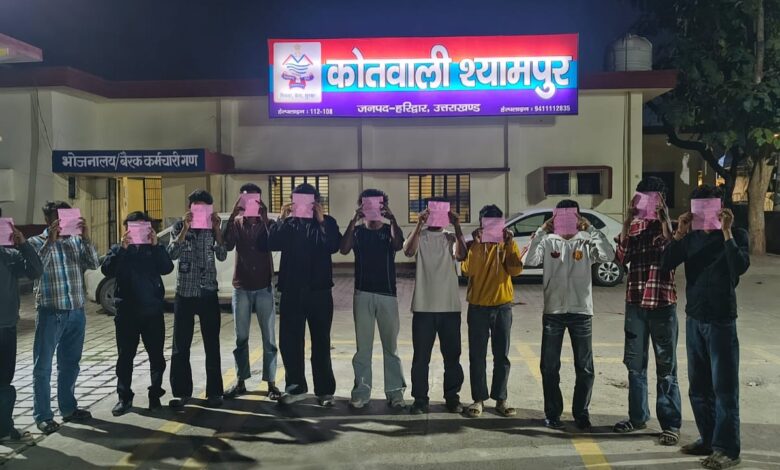 (चिराग कुमार) हरिद्वार। हरिद्वार एसएसपी वरिष्ठ पुलिस अधीक्षक नवनीत सिंह के दिशा निर्देश पर जनपद थाना प्रभारियों द्वारा होली पर्व को लेकर हुडदंगियों पर लगातार लगाम कसी जा रही है। श्यामपुर थाना प्रभारी मनोहर सिंह भंडारी के नेतृत्व में पुलिस टीमें गठित कर क्षेत्र की शांति व्यवस्था को खराब करने वालों को किसी भी सूरत पर बक्सा नहीं जा रहा है। देर रात शनिवार को श्यामपुर थाना पुलिस ने 12 हुड़दंगियों को गिरफ्तार कर पुलिस एक्ट में चालान किया है। वहीं इस बाबत पर श्यामपुर थाना प्रभारी मनोहर सिंह भंडारी ने बताया कि वरिष्ठ पुलिस अधीक्षक के निर्देश पर चलाए जा रहे चेकिंग-सत्यापन कार्यवाही के दौरान 12 व्यक्तियों को ग्राम गाजीवाली बाजार में एकत्र होकर लड़ाई-झगडा कर शान्ति व्यवस्था भंग करने के जुर्म में हिरासत लिया गया। उन्होंने बताया कि भविष्य में हुड़दंग नहीं किए जाने की हिदायत देते हुए पुलिस एक्ट में जुर्माना किया गया।