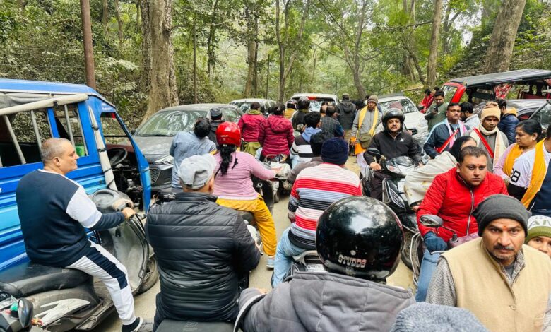 हरिद्वार के पौराणिक बिल्केश्वर मंदिर के बाहर रोड पर यातायात जाम